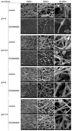 DMAEM@RA played pH-dependent antibiofilm roles on S. mutans and C. albicans dual-species biofilms in vitro. SEM images of S. mutans and C. albicans dual-species biofilms formed after 24 h in the 5% DMAEM@RA groups and the control groups at different pH values. The magnifications were 1000×, 5000×, and 20,000×, respectively.