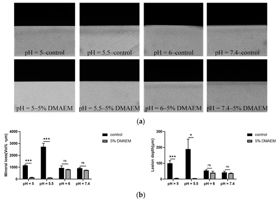 TMR was applied to further investigate if 5% DMAEM@RA could prevent the tooth demineralization caused by S. mutans and C. albicans dual-species biofilms. The TMR microradiographs are shown in Figure 5a. The demineralization degree of the pH = 5–5% DMAEM@RA group and the pH = 5.5–5% DMAEM@RA group was much lower than that of the corresponding control groups, which illustrated that 5% DMAEM@RA could affect enamel demineralization only at pH 5 and 5.5, rather than at pH 6 and 7.4. At the same time, the mineral loss and lesion depth results in Figure 5b illustrated that 5% DMAEM@RA significantly decreased the demineralization degree of enamel caused by the dual-species biofilms in the microbial demineralization model in vitro at pH 5 and 5.5. At these two pH conditions, the mineral loss of the 5% DMAEM@RA groups were evidently lower than the control groups, and the lesion depths of the 5% DMAEM@RA groups were also shallower than control groups. However, these kinds of phenomena were not seen at pH 6 and 7.4. These results again confirmed that pH-responsive DMAEM@RA could only inhibit demineralization under acidic environments.