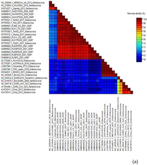 Of the 39 RT-PCR-positive bat samples screened, 29 bat samples were successfully sequenced, and the nucleotide sequences were compared to those in the public database using the “Blastn” algorithm of NCBI BLAST and SDT. Of the 29 newly identified CoVs, 18 belonged to alphacoronaviruses (α-CoV) and 10 to betacoronaviruses (β-CoV). One sample from H. ruber bat (CER024_NGR) was coinfected with alphacoronavirus and betacoronavirus (Table 2). According to the findings, all the nucleotide sequences from β-CoV detected in this study were 91.7–98.7% identical to the E. helvum coronavirus in lineage D (Nobecovirus) previously reported in E. helvum bats in Cameroon, Ghana, Tanzania, and Kenya (Figure 2a). The α-CoV nucleotide sequences were 95.94–98.61% identical to the Alphacoronavirus genus (Chaerephon bat coronavirus) (Figure 2b).