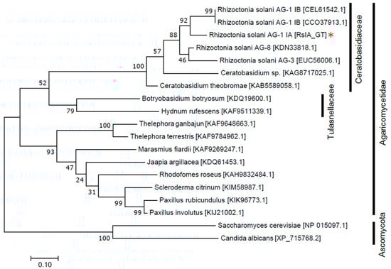 RsIA_GT encodes a 346-aa protein that contains a glycosyltransferase domain (57–241 aa). It belongs to ‘glycosyltransferase family 2’ in CAZymes classification [http://www.cazy.org, accessed on 26 July 2022]. To see the distribution and conserved degree of the homologs of this protein in fungi, BLASTP searches against the non-redundant protein database ‘nr’ were performed with E-value of 1.0 × 10−10 and the minimum query coverage of 75%. We found homologous proteins in the fungal categories of Basidiomycota [386 proteins in 293 species], Ascomycota [881 proteins in 642 species], Mucoromycota [78 proteins in 63 species], Zoopagomycota [11 proteins in 10 species], and Chytridiomycota [14 proteins in 8 species]. In contrast, no homologous proteins were found in the earliest-diverging categories Microsporidia and Cryptomycota. These results implicate that fungi acquired and evolved this glycosyltransferase during the process of adaptation and co-evolution between pathogen fungi and hosts. To check the molecular evolutionary relationship of the glycosyltransferase in basidiomycetes, we analyzed selected 16 glycosyltransferase-homologous proteins in 13 fungal species in a phylogenetic tree. The maximum likelihood tree formed two major clusters for (1) proteins in Ceratobasidiaceae and Tulasnellaceae, and (2) proteins in other Agaricomycetes (Figure 1). As expected, R. solani anastomosis groups are located in the same clade with closer positions (Figure 1). The RsIA_GT showed high identify and similarity with two proteins in R. solani AG-1 IB (CEL61542.1, 93% identity, 95% similarity; CCO37913.1, 88% identity, 91% similarity), one protein in R. solani AG-3 (EUC56006.1, 89% identity, 93% similarity), and one protein in R. solani AG-8 (KDN33818.1, 88% identity, 92% similarity) (Table S2). We could find a highly homologous sequence (IC-TC_DN321_c0_g1_i1) with RsIA_GT by a TBLASTN search against the AG-1 IC transcriptome contigs assembled by Yamamoto et al. []. It indicates the evolutionary conservation of RsIA_GT orthologues in AG-1.