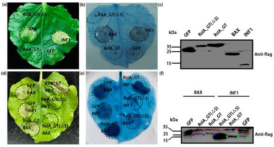 Proteins were extracted, according to Moffett et al. [] described, and made a little modification. Approximately 0.5 g leaf tissues of N. benthamiana, respectively, expressed RsIA_GT-FLAG, RsIA_GT(ΔS)-FLAG, INF1-FLAG, BAX-FLAG, and GFP-FLAG were harvested at two days post infiltration and powdered in liquid nitrogen using mortars and pestles. Resultant powders were re-suspended by 1.0 mL of extraction buffer [25 mM Tris-HCl (pH 7.5), 1 mM EDTA, 150 mM NaCl, 10% glycerol, 5 mM dithiothreitol, and 2% polyvinylpolypyrrolidone] and centrifuged at 4 °C for 15 min. The supernatant containing the transiently expressed proteins was, respectively, collected into new centrifuge tubes. The extracted proteins were separated by electrophoresis in 12.5%, 10%, or 15% sodium dodecyl sulfate–polyacrylamide gels. Then, the separated proteins were transferred to nitrocellulose membranes at 25 volts for 10 min. The nitrocellulose membranes were washed three times by TBS-T buffer [50 mM Tris-HCl, (pH 7.5), 0.05% Tween 20, 150 mM NaCl] and then blocked with TBS-T buffer containing 5% milk for 1.5 h at room temperature. The membranes were washed three times by TBS-T buffer and then incubated at 4 °C overnight with TBS-T buffer containing 5% milk and an anti-FLAG antibody (1:2000 dilution, Sangon Biotech, Shanghai, China). The membranes were washed three times with TBS-T buffer and then incubated with the mouse-anti-rabbit second antibody for 1 h at room temperature. Then, these membranes were visualized with BeyoECL Star kit (Beyotime Biotechnology, Shanghai, China) and photographed on X-ray films.