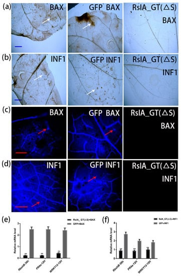 As mentioned above, RsIA_GT(ΔS) suppresses HR cell death induced by INF1 and BAX. In order to test whether the productions of H2O2 and callose triggered by INF1 and BAX are also inhibited by RsIA_GT(ΔS), we performed DAB and aniline blue staining on N. benthamiana leaves after co-expression of RsIA_GT(ΔS) with INF1 or BAX. In the leaves expressed with BAX or INF1, the stained areas with DAB (Figure 5a,b) or aniline blue (Figure 5c,d) were detected 12 h and 24 h after the agroinfiltrations, respectively. When RsIA_GT(ΔS) was co-expressed with BAX or INF1, these signals were almost undetected (Figure 5a–d). The GFP was used as a negative control; however, no suppression of the signals was observed (Figure 5a–d). These results indicate that RsIA_GT(ΔS) suppressed the H2O2 production and callose deposition induced by BAX and INF1.