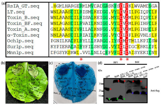 Conservation of key amino acid residues of glycosyltransferase catalytic domain in RsIA_GT and assessment of their requirements for the suppression activity of HR cell death: (a) Alignment of the amino acid sequences of glycosyltransferase catalytic domain of RsIA_GT and eight large clostridial toxins: LT (X82638 from Clostridium sordellii strain 6018), Toxin_B (X53138 from Clostridioides difficile strain VPI 10463), Toxin_BF (Z23277 from C. difficile strain 1470), Toxin_A (M30307 from C. difficile strain VPI 10463), α-Toxin (Z48636 from Clostridium novyi), Ochlp (D11095 from Saccharomyces cerevisiae), Surlp (M96648 from S. cerevisiae), and Mnnlp (L23753 from Saccharomyces cerevisiae). The red asterisks indicate the key amino acid residues of glycosyltransferase catalytic domain. (b,c) Co-expression analysis of RsIA_GT(ΔS), RsIA_GT(ΔS)R154A D168A D170A, and GFP with INF1 or BAX in N. benthamiana leaves for the evaluation of the requirement of the key amino acids for the immune suppression activity of RsIA_GT(ΔS). The indicated combinations of genes were agroinfiltrated, and necrosis (b) and cell death detected with trypan blue staining (c) were observed at three days after the treatment. GFP served as a negative control. (d) Western blot confirming the co-expression of RsIA_GT(ΔS), RsIA_GT(ΔS)R154A D168A D170A, and GFP with BAX or INF1 using an anti-FLAG antibody. The blue asterisks indicate the protein bands of BAX. The green asterisks indicate the protein bands of INF1. The red asterisks indicate the protein bands of the correct size.