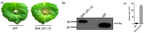 To examine whether the overexpression of RsIA_GT(ΔS) in host plants enhances the susceptibility to R. solani AG-1 IA, we transiently expressed the RsIA_GT(ΔS) protein in the leaves of N. benthamiana by the agroinfiltration method. After two days, the leaves were inoculated with a 2 mm2 active mycelial plug of R. solani AG-1 IA. GFP was used as a negative control. In the leaves infiltrated with Agrobacterium harboring RsIA_GT(ΔS), significant necrotic lesions were observed compared with those of the GFP control (Figure 7a,b). Quantitative measurement of the lesion area demonstrated that the lesions observed in the leaves with transient expression of RsIA_GT(ΔS) were over 27 times than that of the control (Figure 7c). This result showed that the disease symptom caused by R. solani AG-1 IA was promoted in the leaves expressing RsIA_GT(ΔS). The consistency of it with the interference in the plant defense responses indicates the virulence function of RsIA_GT(ΔS).