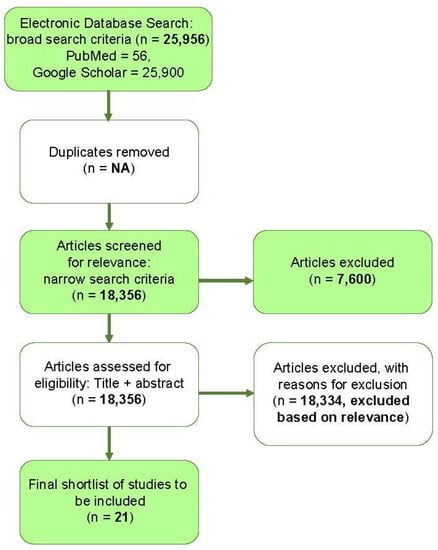 The initial search strategy resulted in 25,956 studies. After duplicate removal and screening, 21 articles were deemed reliable for review. The flow diagram for study selection is shown in Figure 1.