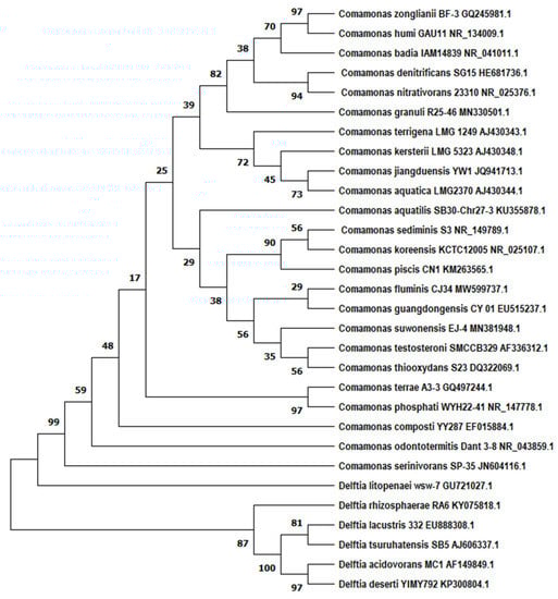 Phylogenetic tree of the genus Comamonas (accession numbers are given alongside species name) with the closely related genus Delftia. The tree was built with 16S rDNA genes (partial sequences of ~1400 bp) using neighbor-joining with the Tajma-Nei method utilizing the MEGA 11 software package. Bootstrap values are represented by numbers at nodes. These are based on 1000 resamplings. Bar, 0.0050 substitutions per site [26,27]. It should be remembered that these analyses are based upon 16S rDNA and, as such, are suggestive only.