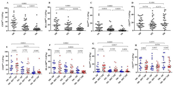 2.2. TB Treatment Reduces the Expression of Activation Markers on MTB-Specific CD4+ T-Cells but Not on Total CD4+ T-Cells, Regardless of HIV Status
