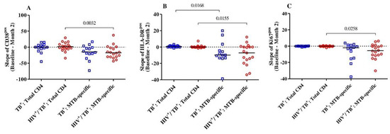 The slopes (difference from baseline to month 2) of the expression of activation markers CD38 (A), HLA-DR (B) and Ki67 (C) on MTB-specific and total CD4+ T-cells were compared between and among the HIV/TB coinfected (n = 19) and TB monoinfected (n = 14) groups. The red circles and blue squares represent HIV/TB coinfected and TB monoinfected subjects, respectively. Bars represent medians. Statistical analyses were performed using the Mann–Whitney test. p-values are indicated.