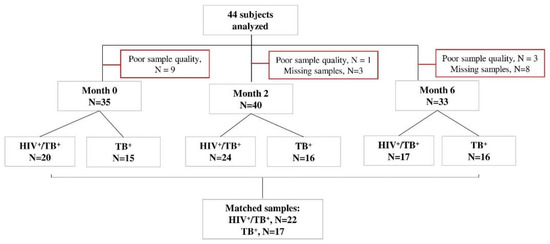 Xpert MTB/RIF (Rifampicin)-positive study participants were recruited in Machava and Mavalane TB Research Centers in Mozambique as part of the TB sequel study [48]. Consenting TB patients with positive Xpert MTB/RIF (Cepheid, Sunnyvale, CA, USA) results were tested for HIV following the national algorithm and were followed from baseline until 12 months after TB therapy initiation during seven study visits (baseline, 14 days and 2, 4, 6, 9 and 12 months). All study participants were TB drug-sensitive. Forty-one had 6 months of a TB regimen, an intensive phase for two months with isoniazid, rifampicin, ethambutol and pyrazinamide and a continuous phase for four months with isoniazid and rifampicin. Three participants were relapsed TB cases when they were recruited into our study and received 8 months of TB treatment. The HIV-positive participants received an antiretroviral treatment composed of Tenofovir/Lamivudine/Efavirenz. During each study visit under TB treatment, liquid and solid TB culture (Lowenstein–Jensen) was performed. In those who were positive for HIV, CD4+ T-cell levels were determined at baseline. Whole blood samples were collected for Peripheral Blood Mononuclear Cells (PBMCs) processing and cryopreservation at baseline, month 2 and month 6 for all participants. Forty-six subjects were selected for our analyses based on the availability of PBMC samples and available data on HIV status, CD4+ T-cell counts, pulmonary function and spirometry at baseline, month 2 and month 6. Samples with poor cellular quality or viability were excluded (Figure 4).