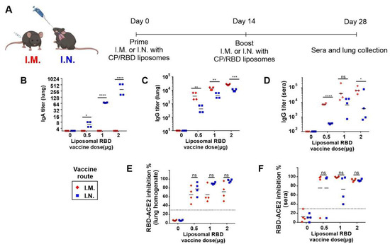 Immunogenic liposome-displayed RBD for I.M. and I.N. immunization. K18 hACE2 transgenic mice were immunized with CP/RBD on day 0 and 14 intranasally (I.N.; blue) or intramuscularly (I.M.; red). Lung homogenates and serum were collected on day 28. (A) Schematic representation of the immunization schedule. Anti-RBD lung IgA (B), lung IgG (C) and sera IgG (D) ELISA titers in K18 hACE2 transgenic mice immunized I.N. or I.M. with the indicated RBD dose. Antibody function was assessed with a sVNT assay with post-immune lung homogenates (E) and sera (F). n = 4 mice per group. Lines represent geometric (titer) and arithmetic (sVNT) mean. A two-sided Student T-test using log-transformed titer or sVNT data was used to analyze differences, * p < 0.05, ** p < 0.01, *** p < 0.001, **** p < 0.0001.