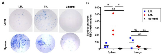 A total of 3 × 105 splenocytes or lung cells, were seeded in an ELISpot plate, and 5 µg/mL of RBD was added to each well. The cells were cultured in 5% CO2/95% air at 37 °C in a humidified chamber for 24 h. The detection of spots was performed according to the manufacturer instructions from Immunospot, using the Murine IFN-γ Single-Color ELISPOT kit. The next day, the plate was washed twice with PBS and twice with PBS-T. The wells were incubated with 80 µL of anti-murine IFNγ (Biotin) antibody detection buffer for 2 h. Later, the wells were washed three times with PBS-T, then incubated with Streptavidin-AP for 0.5 h. After the incubation, each well was washed with PBS-T twice and distilled water twice. To develop spots, the plates were incubated for 15 min at RT, with 80 μL per well of blue developer solution provided from the manufacturer. The images were acquired with CTL ImmunoSpot S6 FluoroCore analyzer.
