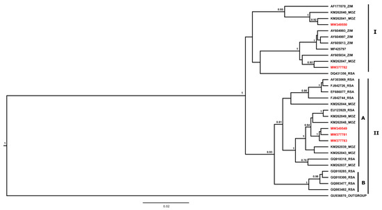 Maximum clade credibility tree showing the placement of the five Mozambican RABVs. Nucleotide sequences of a partial region of the glycoprotein gene and the G-L intergenic region were used in the analysis. The phylogenetic analysis was conducted using BEAST software version 2.5.0. [31] with posterior probabilities of 0.75. The posterior probabilities are shown on the nodes supporting the branches, and only those equal to or above 0.75 were retained. The analysis involved 32 nucleotide sequences, and those used in this study (Table S3) are represented by red letters.