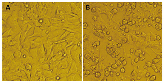 HN1304M causes cytopathic changes in BHK-21 cells. (A) Morphology of normal BHK-21 cells; (B) morphology of BHK-21 cells after 72 h of infection with HN1304M, showing cell shrinkage and sloughing.