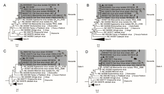 The phylogenetic relationship between the HN1304M virus and other viruses of the Orthobunyavirus genus in the Simbu serogroup was analyzed using the maximum likelihood method. The phylogenetic tree constructed by aligning the nucleotide sequences of the L gene (A), M gene (B), and S gene (C) and a partial sequence of the S gene (365 nt) (D). The HN1304M strain is marked with black triangles. The Cat Que virus clade is shaded in gray, where the host origin of the virus strains is indicated by the following symbols: