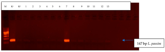 Electrophoretic separation of amplification products (L. passim) in bumblebee samples. M-GeneRulerTM 100 bp DNA Ladder Plus volume marker (Fermentas); K+–positive control, includes DNA isolated from L. passim (University of Belgrade, Faculty of Veterinary Medicine, Department of Biology); K0–”zero” control, DNA was replaced with water; Paths 1 to 13–bumblebee samples.