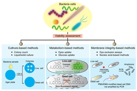 As mentioned earlier, among the three criteria (culturability, metabolic activity, and membrane integrity) for viability assessments, membrane integrity is the most reliable criterion. Bacteria can enter the states allowing them to silence the reproducibility and metabolic activity; therefore, some bacteria cannot be detected using the culturability and metabolic activity criteria. However, membrane integrity is critical for bacterial function and survival [62].
