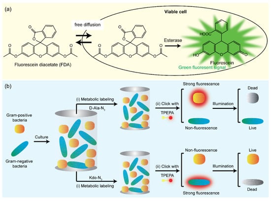 The metabolic activity of viable bacteria can be detected based on their uptake of dyes through bacterial membranes. When the dyes enter the bacterial membrane, they are hydrolyzed by an active enzyme system, such as esterases, lipases, and proteases, to convert nonfluorescent to detectable fluorescent signals. Fluorescein diacetate (FDA) is a common dye used for viability assessment based on the activity of nonspecific enzymes, as mentioned above, and it is a nonpolar and nonfluorescent dye. FDA has lipophilic properties because it comprises two acetate groups and is, therefore, permeable to lipid bilayer membranes of bacteria [33]. After the transportation of FDA into bacteria, it is hydrolyzed to fluorescein by nonspecific intracellular enzymes and releases measurable fluorescent signals (Figure 2a) [34]. Fluorescein is a polar molecule and, therefore, cannot move across bacterial lipid membranes. As a result, fluorescent signals are accumulated inside bacteria. The advantages of this technology are as follows: (1) FDA uptake does not require any specific transport pathway through the membranes because FDA can enter bacteria via a passive transport mechanism, and (2) extracellular FDA does not produce any background signal [33]. However, FDA carries severe disadvantages [35]. First, the quenching effect can occur when the fluorescein concentration inside bacteria is too elevated. Second, the FDA-based method is highly sensitive to pH. The acidic environment can enhance the protonation of fluorescein, which can enhance the efflux of fluorescein via passive efflux, decreasing the fluorescent signal. The product of FDA hydrolysis is acetic acid; therefore, it can decrease the intracellular pH. The pH also affects intracellular enzyme activity; each enzyme has different optimal pH conditions. Because plenty of intracellular enzymes catalyze FDA hydrolysis, optimizing the pH condition for FDA hydrolysis is difficult [36,37,38]. Nevertheless, biological metabolism-based fluorescent labeling can greatly improve bacteria labeling using the combination of a fluorescent probe and a bio-orthogonal group. Furthermore, it can be employed as an effective approach for the discrimination of peptidoglycan of gram-positive bacteria and lipopolysaccharide of gram-negative bacteria [39,40,41,42]. For example, a bacteria-metabolizable dual-functional probe TPEPy-d-Ala was developed for fluorescence turn-on imaging of bacteria based on aggregation-induced emission [39]. When metabolically bound with bacterial peptidoglycan, the mobility of the TPEPy-d-Ala probe is inhibited, resulting in clear visualization of intracellular bacteria by fluorescence signal enhancements. In another study, Wu et al. designed a bio-orthogonal fluorescence dye (TPEPA) for discriminating gram-positive (Staphylococcus aureus) and gram-negative (E. coli) bacteria by metabolic engineering (Figure 2b) [42]. Due to the different structures of bacteria morphology, this synthesized TPEPA dye could distinguish live and dead bacteria via selective imaging of metabolically decorated gram-negative bacteria with Kdo-N3 and gram-positive bacteria with D-Ala-N3 under a fluorescence microscope, respectively.