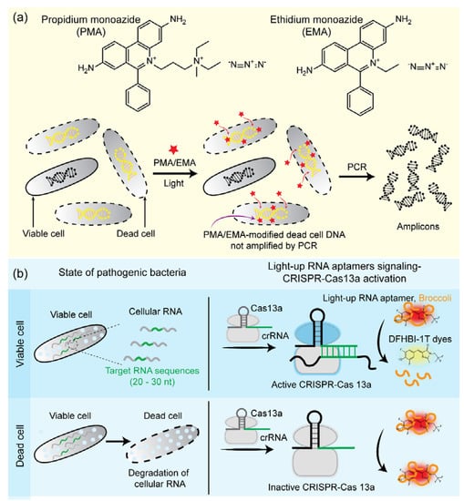 (a) Schematic illustration of the working principle of bacterial viability using the combination of PMA/EMA staining with polymerase chain reaction (PCR). Red star, PMA/EMA. (b) Schematic illustration of light−up RNA aptamer signaling−clustered regularly interspaced short palindromic repeats (CRISPR)/Cas13a for mix−and−read detection of viable pathogenic bacteria. Broccoli is a special RNA aptamer sequence that can bind and turn on specific dyes, and it was designed to serve as the signal reporter for CRISPR−Cas13a [112].