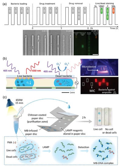 In recent years, microfluidics, also known as lab-on-a-chip, has been introduced and gained much attention from the public due to its wide-ranging applications in different fields, especially in cell biological research [114,115,116,117]. Generally, microfluidic technology is a fast-rising system that offers the integration of various processes into a single microdevice (micrometers to centimeters in size). Microdevices can offer highly efficient, sensitive, and rapid analysis with low energy consumption [118]. Due to these advantages, various viability assessments based on microfluidics have emerged for discriminating between live and dead bacterial cells [119,120]. For example, Bamford et al. introduced a combined system, including microfluidic channels and time-lapse microscopy, for observing VBNC cells before, during, and after drug treatment based on a fluorescent signal from SYTO 9 dyes (Figure 5a) [121]. Using this microdevice, a series of actions, such as culturing bacteria, treating drugs, and staining live/dead cells, could be performed simultaneously under microscopy and could capture images to investigate phenotypic or genotypic heterogeneity. In contrast, Qiu et al. fabricated a digital microfluidic device for an antimicrobial susceptibility test using an optical oxygen sensor film (Figure 5b) [122]. By measuring extracellular dissolved oxygen, this device could allow on-chip culturing and monitoring of E. coli growth (red fluorescent signals) with minimal sample handling and lower-volume cultures. In 2015, Chang et al. invested an integrated microfluidic system to rapidly detect live Staphylococcus from joint fluid as a medical application, helping with immediate medical decisions and antibiotic choices [123]. The bacterial sample was incubated with EMA and vancomycin-conjugated magnetic beads for distinguishing live bacteria and amplified 16S for bacterial typing by PCR. Using a PDMS integrated device, live bacteria were successfully detected within 30 min, and the LOD was ~102 CFU per reaction. For foodborne pathogen detection, Etayash et al. used the microfluidic cantilever for the in situ detection and discrimination of Listeria monocytogenes and E. coli, and the microdevice could detect bacteria at a concentration of single-cell per microliter [124]. Briefly, a biomaterial microcantilever embeds a microfluidic channel where the internal surfaces are chemically or physically functionalized with receptors that can selectively capture bacteria. Moreover, this device also can serve as a high-throughput device for the real-time detection of bacteria and allows discrimination between intact and dead E. coli and their metabolic response to antibiotics based on the presence of metabolic activity. In another study, Tung et al. introduced a paper-based microfluidic device that integrated treatment and molecular biology to detect viable E. coli O157:H7 and Salmonella spp. (Figure 5c) [125]. The paper-based device employed the most advanced techniques, such as chitosan-based DNA extraction, isothermal amplification (LAMP), and colorimetric detection, for screening multiple pathogens. In another study, E. coli was successfully discriminated against using microfluidics based on a centrifuge platform to perform a LIVE/DEAD BacLight bacterial viability assay [126]. For environmental application, Zhu et al. reported a high-resolution three-dimensional printed microdevice for E. coli detection using an integrated PMA-PCR device [127]. Especially, an on-chip PMMA pretreatment was used to improve the accuracy by eliminating the need for pipetting steps. As a global public health issue, M. tuberculosis is a bacterium that causes serious disease, namely tuberculosis, and is slower in growth than other infectious bacteria; thus, making it difficult and challenging for early detection [128]. Recently, Wang et al. introduced an integrated microfluidic system to automatically detect live M. tuberculosis and distinguish dead bacteria from clinical samples [129]. In this study, using this fully integrated microdevice (including bacterial capture, PMA treatment, lysis, and PCR quantification), M. tuberculosis could achieve automated detection in a single chip within 90 min, and the LOD was as low as 100 CFU. From these examples, numerous microfluidic devices have been fabricated to integrate various processes required for viability assessment, such as dye treatment, DNA extraction, amplification, and detection. DNA-based analyses using a microdevice reduce the time and cost of the bacterial viability test. Therefore, the obvious advantages provided by microfluidic technology make this approach powerful for viability assessment.