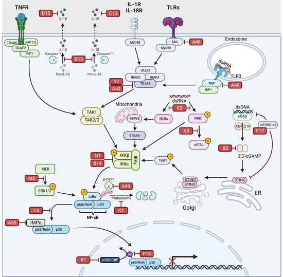 - Zhang, Q.; Lenardo, M.J.; Baltimore, D. 30 Years of NF-κB: A Blossoming of Relevance to Human Pathobiology. Cell 2017, 168, 37–57. [Google Scholar] [CrossRef] [PubMed]
