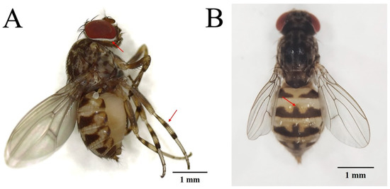 The typical morphological features(arrows) of Phortica okadai. (A) Abdomen of Phortica okadai showing three dark bands on the tibial band, a white ring around the eyes. (B) A “mountain” shaped black horizontal band on the dorsal side of the 3rd–5th abdominal segments.
