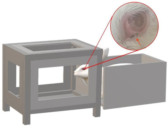 Approximately 4 h before experimentally infecting the female rabbit (6-week-old, 2.6 kg), the infected P. okadai were starved and dehydrated. We designed a device with a cage (22 × 22 × 27 cm) on the left and secured the rabbit’s body in the enclosure on the right (24 × 18 × 18 cm) (Figure 4). The infection procedures were performed once a day (20 min each time), with appropriate breaks in the middle, depending on the rabbit’s response (Supplementary Materials S1: Video S1: Chapter S5). The infection process lasted for two weeks, and the rabbit was observed daily for the presence of T. callipaeda worms. During this period, dead flies were collected and dissected every two days and examined.