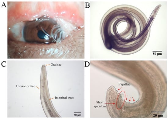 Thelazia callipaeda morphological identification. (A) The left eye of the patient with Thelazia callipaeda adult worms (n = 11, F:M = 7:4). (B) Adult male Thelazia callipaeda show a transparent spiral with a clearly visible internal digestive tract. (C) Anterior end of adult female Thelazia callipaeda showing oral sac, digestive tract, and coiled larvae in the uterus. (D) Posterior end of a male Thelazia callipaeda with non-protruding anal opening, post-anal papilla, and short copulatory spines.