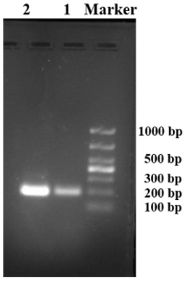 We cloned and amplified the cox1 gene of the worm by PCR, which produced a 200 bp DNA fragment (Figure 6). Sequencing results showed that the characteristic cox1 gene was approximately 199 bp (accession number: OP164161). Since the gene sequence was only 199 bp, identification of the specific type of T. callipaeda was not possible; however, by analyzing the data (Supplementary Materials S2: Table S1), it could be inferred that the genotypes may belong to h3, h7, h15, h16, h18, h19, h20, and h21 (only h7 in Korea, others in China). The sequence similarity of this cox1 gene with that of European T. callipaeda haplotypes (h1 AM042549) was 97.4% and with that of Japanese T. callipaeda (h9–h12) was 97.4–99.4%.