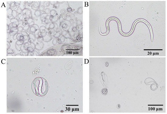 Due to artificial extrusion, numerous newborn larvae and larvae curled inside the capsule were visible under the microscope (Figure 7A). The L1 had a blunt and rounded head, a slender and pointed tail, a visible mouth capsule, and a complete digestive tract; the annulus formation had not yet begun, with a size of approximately (100–120) × 5 μm (Figure 7B). The larvae were curled in the oocyst, and the follicle size was approximately 40–50 μm (Figure 7C; Supplementary Materials S1: Video S1: Chapter S2); however, at this point, the larvae developed slower than the larvae follicle in a semi-ruptured state (Figure 7D) and were smaller in size.