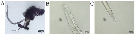Phortica okadai dissection and Thelazia callipaeda observations. (A) L3 dissected from the mouthparts of Phortica okadai. (B) Anterior end of L3 of Thelazia callipaeda showing oral sac, digestive tract, and serrated folded body surface. (C) Posterior end of L3 of Thelazia callipaeda with a dorsal papilla and two lateral papillae.