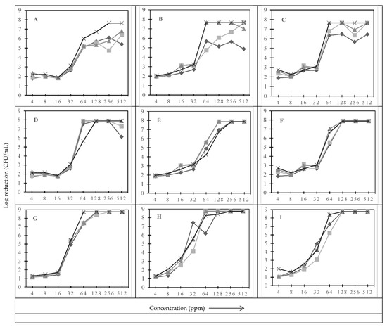 Figure 1 shows the effect of type of sanitizer, concentration of sanitizer and treatment time on the log reduction of L. monocytogenes and L. innocua. A reduction of 1.78 to 6.05 log CFU/mL was observed when L. innocua was subjected to sodium hypochlorite (SHC) treatment at 4 to 512 ppm for 30 s (Figure 1A). As expected, increasing the sanitizer concentration from 4 to 512 ppm increased the log reduction. However, no significant difference (p > 0.05) in log reduction was observed between 4 to 16 ppm and 64 to 512 ppm, whereas a significant difference (p ≤ 0.05) in the reduction was observed between 16 to 64 ppm (Figure 1A). This shows that an optimum concentration of 64 ppm for 30 s to achieve a 5-log reduction of L. innocua is required, beyond which increasing the concentration of SHC did not improve log reduction. Further increasing the treatment time up to 5 min increased the log reduction to more than 6 log CFU/mL in the concentration range of 64 to 512 ppm. Below 64 ppm, no difference in the log reduction was observed among the treatment times of 30 s, 1, 2.5, and 5 min (Figure 1A). Similar trends in the reduction were observed for PAA (Figure 1B) and BAC (Figure 1C) treatments of up to 32 ppm. Beyond 32 ppm, a significant increase in the log reduction was observed for both PAA and BAC at 2.5 to 5 min treatment times (Figure 1B,C). Similar findings were reported by Riazi et al. [25] and Belessi et al. [28] when L. monocytogenes was subjected to different types of sanitizers.