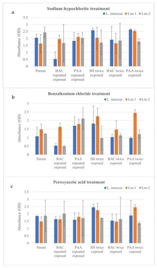 Measurement of biofilm production ability of different Listeria strains (which were either pre-exposed or not exposed to different sanitizers) in 16 ppm of (a) sodium hypochlorite (SHC), (b) benzalkonium chloride (BAC), and (c) peroxyacetic acid (PAA) for 72 h.
