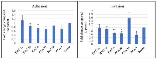 CaCO-2 cell adhesion and invasion of repeatedly sanitizer-exposed L. innocua compared to parent strain. BAC 4, 16, 32 and PAA4, 16, 32 refers to L. innocua cells that were previously subjected to repeated treatment with peroxyacetic acid and benzalkonium chloride at 4, 16 and 32 ppm, respectively. The adhesion and invasion of L. innocua to Caco-2 cells were expressed as a fold change relative to the untreated parent strain. The error bars represent the standard error of the mean. * p < 0.05 and ** p < 0.01.