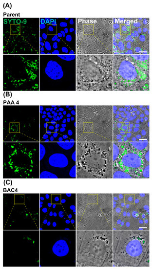 To further validate the decrease in invasion of L. innocua treated with sublethal concentrations of PAA and BAC, we performed confocal analysis using SYTO 9, a fluorescent nucleic acid stain widely used in food safety analysis to stain live bacteria [43]. Confocal images of Caco-2 cells invaded by L. innocua previously exposed to BAC 4 ppm and PAA 4 ppm indicated less SYTO 9-positive L. innocua compared to the parent strain (Figure 4). In summary, these data demonstrated that sublethal exposure of L. innocua to sanitizers significantly altered invasion while not significantly affecting the adhesion to Caco-2 cells.