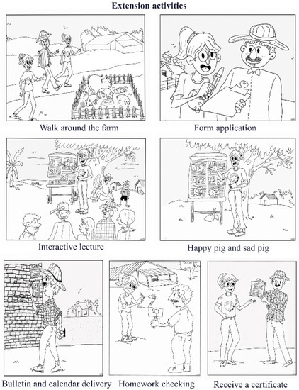 Among the extension proposals used, the “Walk around the farm” provided a view of the differences between the farms, and an initial diagnosis of problems encountered in pig raising, particularly insofar as they concern the facilities, as well as talking with the farmers and listening to what they had to say. Walking around a farm is helpful to reach a participatory diagnosis and to garner information used in plans for later application in rural areas [54]. After these initial impressions, the activity of mediation of information through the interactive lecture with an instrument similar to a large book was well attended by the participants, especially when the information under discussion was illustrated with real pictures or photographs. The strategy of using pictures, especially real ones such as photographs, facilitates the transmission of information in field extension activities, especially for people with low levels of literacy [17].