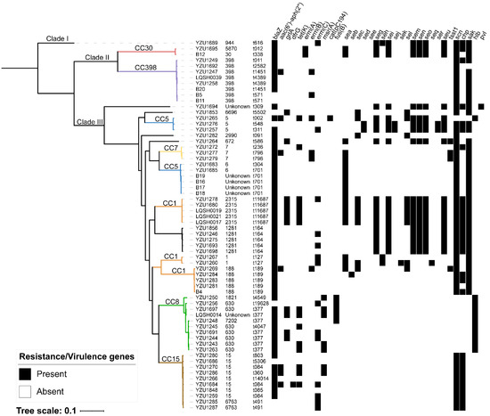 WGS data were used for genotypic characterization, including spa typing and MLST. The sequence types (STs) and clone complexes (CCs) were obtained by submitting the whole genome sequence of isolates to the S. aureus MLST database (https://pubmlst.org/organisms/staphylococcus-aureus accessed on 15 April 2022). The spa type of each S. aureus isolate was determined using spaTyper (https://pubmlst.org/organisms/staphylococcus-aureus accessed on 15 April 2022). Furthermore, the WGS data were also used to identify AMR genes and virulence genes. PlasmidFinder was used to detect plasmids (https://cge.food.dtu.dk/services/PlasmidFinder/ accessed on 7 August 2022). ResFinder was used to detect AMR genes (https://cge.food.dtu.dk/services/ResFinder/ accessed on 15 April 2022). Virulence genes were identified using BLAST against the VFDB database (mgc.ac.cn/VFs/). The VirulenceFinder database was used to detect eighteen staphylococcal enterotoxins genes (https://cge.food.dtu.dk/services/VirulenceFinder/ accessed on 7 August 2022). The prophages were predicted using PHASTER [30]. The phylogenetic tree of the MRSA strains was constructed based on core genome single-nucleotide polymorphism (cgSNP) alignment using ParSNP [31].
