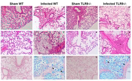 Both WT and TLR9-/- mice had their lungs severely injured after 21 days of C. gattii infection. Atelectasis, alveolar congestion, hemorrhage, increased macrophage aggregation, cellular infiltrate and thickening of alveolar walls were observed in the lungs of both infected groups 21 days after C. gattii inoculum (Figure 1B,H). However, TLR9-/- mice showed generalized alveolar destruction, intense cellular infiltrate and epithelial disintegration with loss of bronchial epithelial cells (Figure 1D,H). Curiously, in a previous study, our group showed that there was no difference between TLR9-/- and WT mouse lung CFU 21 days post C. gattii infection, as well as a higher frequency of titan cells in the lungs, evidencing an increased susceptibility to C. gattii [41]. Recently described, titan cells are frequently associated with the Th2 immune response and the increased susceptibility of mice in cryptococcal experimental models, as well as with in vitro infection assays that have shown the immunomodulatory function of these cells [42,43,44,45]. As described in our previous research, C. gattii titan cells were observed in the lungs of both WT and TLR9-/- mice (Figure 1J,L).