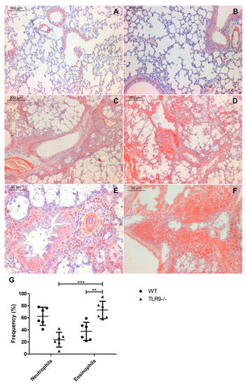2.2. TLR9-/- Infected Mice Have Hypereosinophilia in Mixed Inflammatory Infiltrate