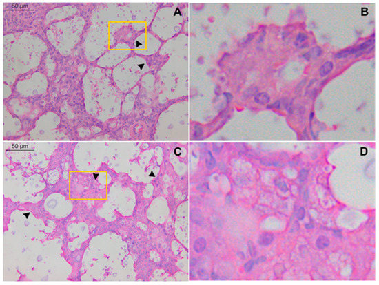 Type 2 alveolar epithelial cell hyperplasia during C. gattii infection. WT and TLR9-/- mice intratracheally received 104 C. gattii yeasts suspended in 30 µL of PBS. A total of 21 days after inoculum, both groups were euthanized, and the organs were collected and prepared for histology as described in Methods. Representative lung histological sections from C. gattii-infected WT mice (A,B) (n = 4) and C. gattii-infected TLR9-/- mice (C,D) (n = 3) stained with hematoxylin and eosin. Large number of epithelial alveolar cells clustered in thickened alveolar walls. In addition, PMN cells, alveolar macrophages and C. gattii titan cells were observed. Histological sections at higher magnification showed type 2 alveolar epithelial cells from both infected WT (B) and TLR9-/- (D) mice. Black arrowheads indicate type 2 alveolar epithelial cell hyperplasia. Magnification ×40 (A,C).