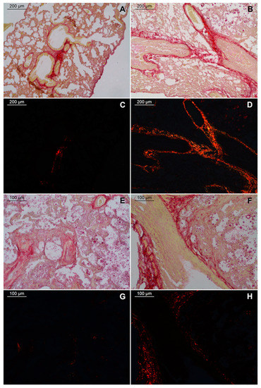 Fibrosis is another aspect resulting from chronic lung inflammation. To investigate fibrosis in the lungs of C57BL/6 mice infected by C. gattii, we stained the histological sections with picrosirius red. We observed areas with a predominance of fibrous elements in the lungs of both WT and TLR9-/- infected groups 21 days after inoculum (Figure 4). However, thick red, strongly birefringent fibers were clearly observable in the lungs of TLR9-deficient mice (Figure 4D,H). Areas with large fibrosis were concentrated around vessels, arterioles and bronchioles of both WT and TLR9-/- infected mice (Figure 4A,B,E,F). In addition, TLR9-/- infected mice had small sites where weakly birefringent orange-green fibers were concentrated (Figure 4D). Interestingly, type 2 alveolar epithelial cell hyperplasia was associated with idiopathic pulmonary fibrosis [53].