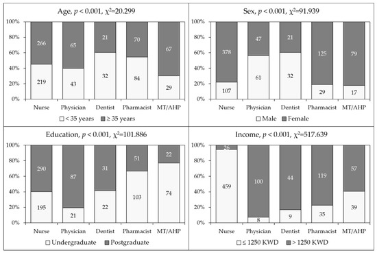 General characteristics of the study sample. MT/AHP: Medical technician/allied health professionals; Education: the highest educational level attained; Income: Monthly income of household; KWD: Kuwaiti dinar.