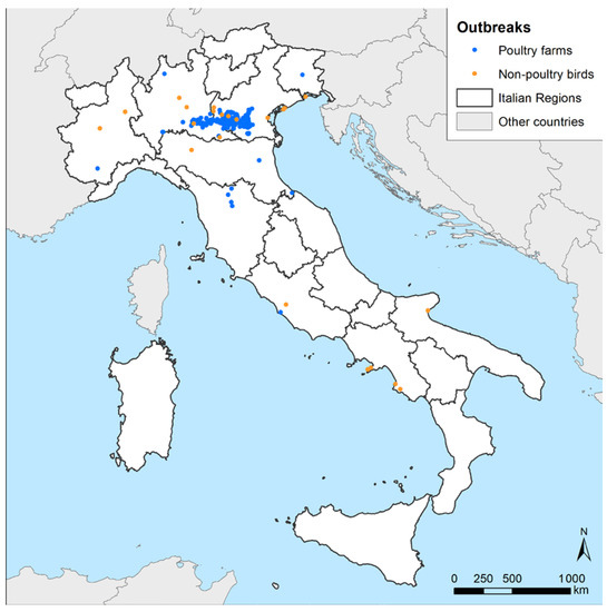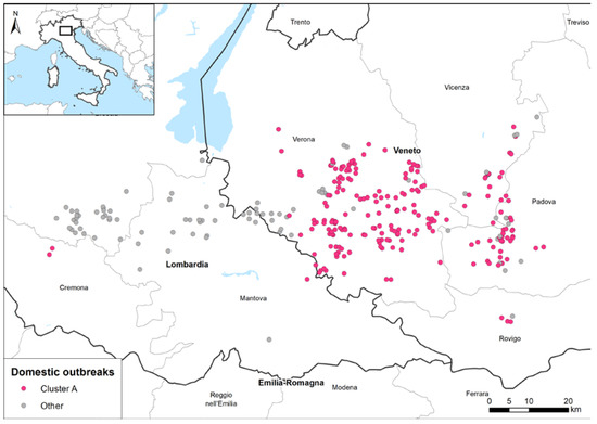 - Mulatti, P.; Ferrè, N.; Marangon, S. Spatial Distribution of 2000-2007 Low Pathogenicity Avian Influenza Epidemics in Northern Italy. In Pandemic Influenza Viruses: Science, Surveillance and Public Health; Majumdar, S., Brenner, F., Huffman, J., McLean, R., Panah, A., Pietrobon, P., Keeler, S., Shive, S., Eds.; Pennsylvania Academy of Science: Easton, PA, USA, 2011; ISBN 978-0-945809-21-0. [Google Scholar]