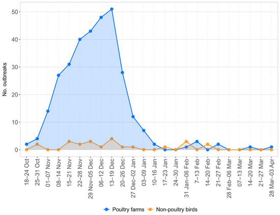 The epidemic curve showing the number of weekly cases in poultry farms and non-poultry birds (22 in wild birds and one in captive birds).