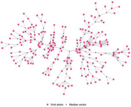 Graphical representation of the estimated genetic network (cluster A). Pink nodes: H5N1 HPAI virus isolated from individual domestic outbreaks belonging to the larger genetic group; grey nodes: estimated median vectors; links: highest genetic similarity between nodes.