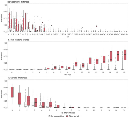 Graphical representation of the predicted probability distributions according to the (a) geographic distances, (b) risk time windows overlap, and (c) viral genetic differences. The x-axis scale for (a,c) was limited to 50 km and 15 bases, respectively, to improve the graph’s readability.