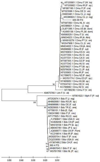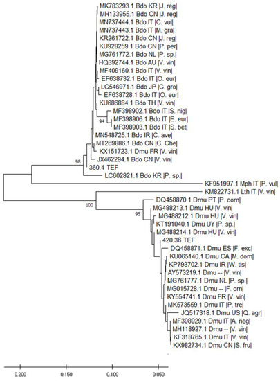 3.2. Molecular Identification of B. dothidea CREA OF 360.4 and D. mutila CREA OF 420.36 and Phylogenetic Analysis
