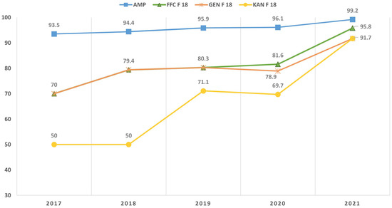 From 2017 to 2021, a statistically significant (p < 0.05) increase in ampicillin-resistant E. coli (93.5–99.2%) was identified (Figure 1, Table S2). During the study period, a statistically significant (p < 0.05) number of ETEC F18+ isolates increased resistance to florfenicol (70–95.8%), gentamicin (70–91.7%), and kanamycin (50–91.7%) (Figure 1, Table S2); no variations were observed for F4+ isolates (Table S2).
