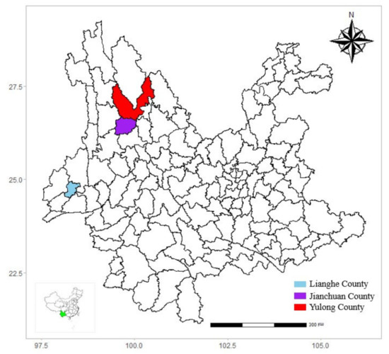The study was conducted throughout a calendar year during all four seasons, including winter (which started from 30 November to 31 December 2015), spring (6 March to 29 March 2016), summer (7 July to 16 July 2016), and autumn (9 October to 18 October 2016). Lianghe was divided into four elevation gradients (1000–1200 m, 1200–1400 m, 1400–1600 m, and more than 1600 m). Jianchuan was divided into three elevation gradients (2250–2450 m, 2450–2650 m, and more than 2650 m). Yulong was divided into four elevation gradients (2400–2600 m, 2600–2800 m, 2800–3000 m, and more than 3000 m).