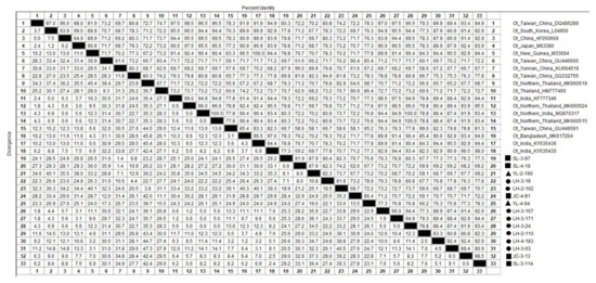 Out of 45 sample sequences (18 from Lianghe, 22 from Jianchuan, and the remaining 5 from Yulong county) (Table S2), the 56 kDa TSA gene nucleotide homology and phylogenetic analysis was conducted, and 13 of the sample sequences aligned with 18 reference sequences (Figure 3), which demonstrated 56.6–100% identity to Ot strains. Among the 45 sample sequences, 35.6% (16/45) shared 91.6-97% identity with Ot Gilliam strains (DQ485289 et al.), and 11.1% (5/45) of sequences shared 80.7–99.5% identity with Ot Karp strains (M33004 et al.). One sequence shared 92.9% identity with Ot TA763 strains (MK660519 et al.). In addition, the sample sequences of JC-4-91, SL-3-132, SL-4-006, SL-4-18, YL-3-288, YL-4-94, YL-4-102, and YL-4-121 (eight sample sequences) were similar and shared 81.1–100% identity with each other. They also shared 81.8–86.2% identity with the Thailand strain (HM777460) and 80.5–86.8% identity with the Taiwan of China strain (GU446605). The sequences of JC-1-74, JC-1-106, JC-2-78, JC-3-66, SL-1-34, SL-3-56, SL-3-97, SL-3-115, SL-4-009, SL-4-19, SL-4-47, SL-4-106, YL-2-190, LH-3-18, and LH-3-162 (15 sample sequences) were similar and shared 83.6–100% identity with each other, and among them, the sequence of JC-1-74, JC-1-106, JC-2-78, JC-3-66, SL-1-34, SL-3-56, SL-3-97, SL-3-115, SL-4-009, SL-4-19, SL-4-47, SL-4-106, YL-2-190, and LH-3-162 shared 90.1–96.1% identity with the Yunnan strain (KU664516). In contrast, LH-3-18 shared 93.4% identity with the Taiwan of China strain (GQ332755) but only shared 87.5% identity with the Yunnan strain (KU664516).
