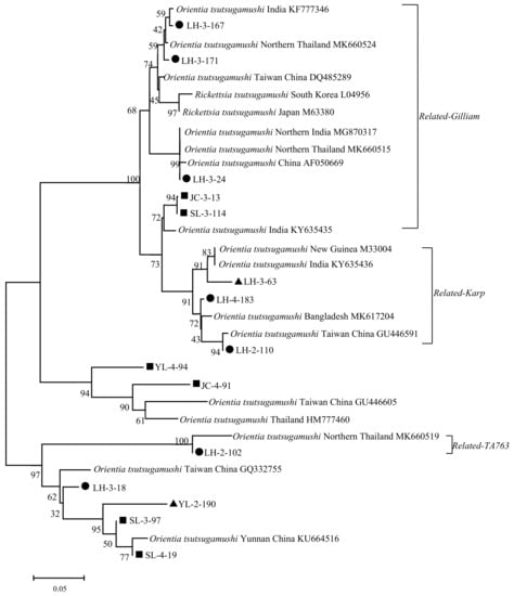 The phylogenetic tree constructed with 56 kDa TSA gene sequence homologies of 13 sample sequences and 18 reference sequences of Ot is shown in Figure 4. The phylogenetic trees constructed using the maximum method demonstrate a similar distribution (Figure S1). The sample sequences of LH-3-167, LH-3-171, LH-3-24, JC-3-13, and SL-3-114 close to the Gilliam strain (DQ485289 et al.) were identified as related-Gilliam genotypes. The sample sequences of LH-3-63, LH-4-183, and LH-2-110 close to the Karp strain (M33004 et al.) were identified as related-Karp genotypes. LH-2-102 had a higher identity with the Thailand TA763 strain, which was identified as related-TA763 strain. YL-4-94 and JC-4-94 were close to the Taiwan (GU446605) and Thailand strains (HM777460), which could be identified as close to the Karp genotype. In addition, SL-3-97, SL-4-19, YL-2-190, and LH-3-18 sequences, although close to the Yunnan (KU664516) and Taiwan strains (GQ332755), resolve independently in one branch.